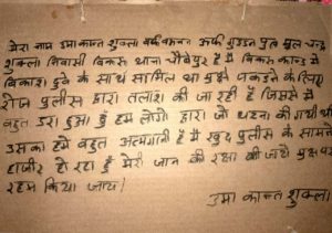 कानपुर: बिकरु कांड में वांछित चल रहे 50 हजार के इनामी उमाकांत ने थानां चौबेपुर में किया सरेंडर। पत्नी और बच्चो को लेकर पहुचा था उमाकांत, एसटीएफ के साथ मुठभेड़ में मारे गए दुर्दान्त अपराधी विकास दुबे का साथी है उमाकांत, एंकाउंटर की दहशत के चलते पत्नी और बच्चो के साथ पहुँचा थाने। बिकरू कांड के नामजद आरोपी उमाकांत उर्फ बउवन शुक्ला ने चौबेपुर थाने में पत्नी और बेटी के साथ किया सरेंडर, उमाकांत के गले में लटकी तख्ती में लिखी बातें।