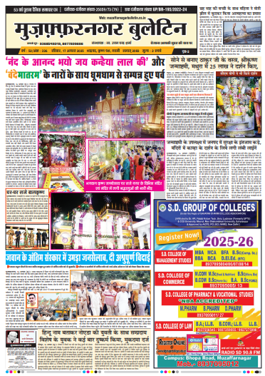 HomeBreaking News Breaking NewsE PaperFeatured E-paper 17-08-2025 By admin August 19, 2025 0 2475 Facebook Twitter Pinterest WhatsApp मुजफ्फरनगर बुलेटिन न्यूज पेपर की पीडीएफ को डाउनलोड़ करने के लिए यहाँ क्लिक करें। 17 AUGUST. Bulletin 2025 (1) Tags#bjp#muzaffarnagarbulletin#muzaffarnagarpolicecmo muzaffarnagarToday E-Paper Share Facebook Twitter Pinterest WhatsApp Previous articleE-paper 15-08-2025Next articleE-paper 18-08-2025 adminhttps://muzaffarnagarbulletin.co.in/new-site Related Articles E Paper E-PAPER 21-02-2026 E Paper E-PAPER 19-02-2026 Uncategorized E-PAPER 18-02-2026 LEAVE A REPLY Cancel reply Comment: Please enter your comment! Name:* Please enter your name here Email:* You have entered an incorrect email address! Please enter your email address here Website: Save my name, email, and website in this browser for the next time I comment. - Advertisement - Latest Articles E Paper E-PAPER 21-02-2026 E Paper E-PAPER 19-02-2026 Uncategorized E-PAPER 18-02-2026 Uncategorized E-PAPER 17-02-2026 Uncategorized E-PAPER 16-02-2026 Load more