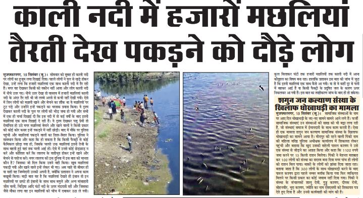 मुजफ्फरनगर, 15 सितंबर (बु)। सोमवार को सुबह ही काली नदी पर लोगों का हुजूम लगा दिखाई दिया। पहले लोगों ने पुल से खड़े होकर देखा, उन्हें लगा कि हजारों मछलियां एक साथ काली नदी में तैर रही हैं। मगर यह देखकर किसी को यकीन नहीं आया और लोग काली नदी में नीचे उतर गए। नीचे उतर देखा तो वास्तव में हजारों मछलियां काली नदी के अंदर तैर रही थी जो लम्बे अरसे से कभी नहीं देखी गयी।